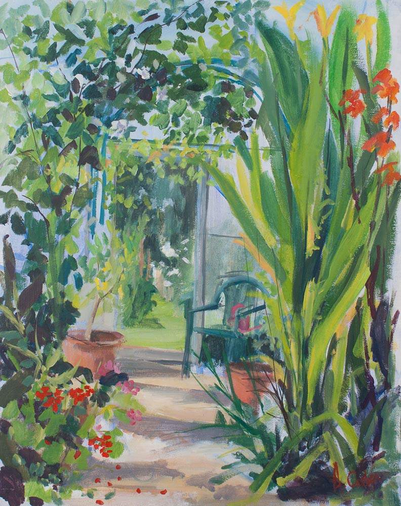 Painted in the greenhouse revelliing in the shapes and vibrant greenery- this painting features in my dvd!